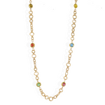 Long collier station comportant une chaîne composée d'anneaux circulaires faits à la main et ornée d'une série de perles à facettes colorées. À porter avec ou autour pour un look plus affirmé !